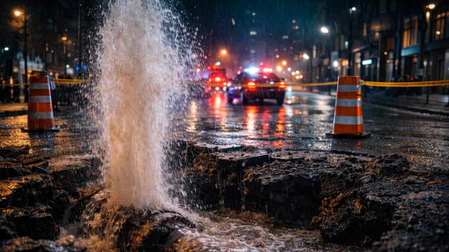 Water main repair restores municipal water supply and pressure supporting plumbing systems throughout large buildings.